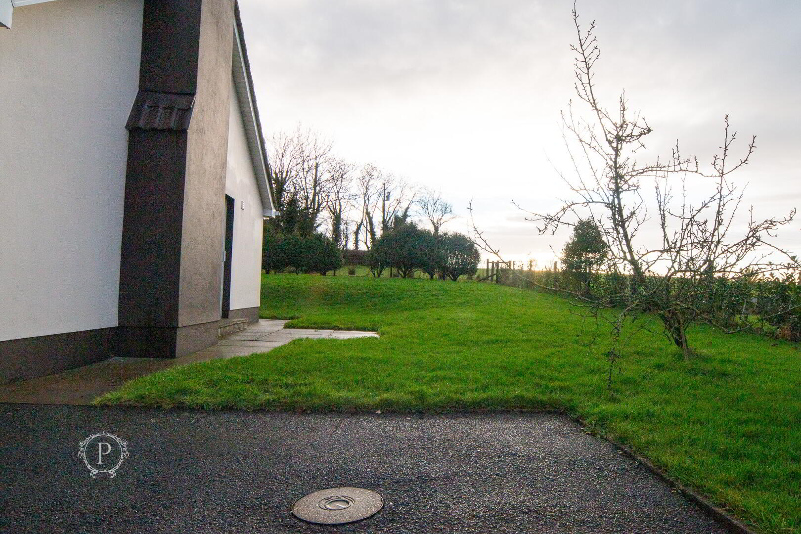 The home is approached by a long private driveway, providing ample off-street parking and an immediate sense of arrival and seclusion. Lawned gardens extend around the property, offering expansive, level outdoor space ideal for children to play, pets to roam freely, or simply for enjoying quiet moments outdoors.
