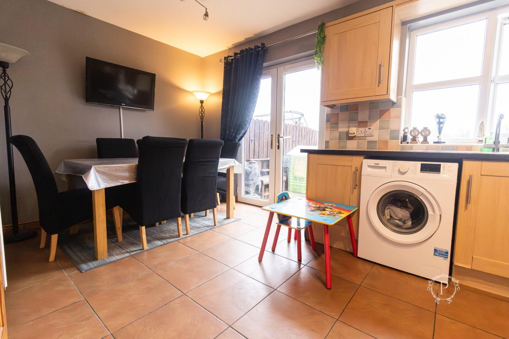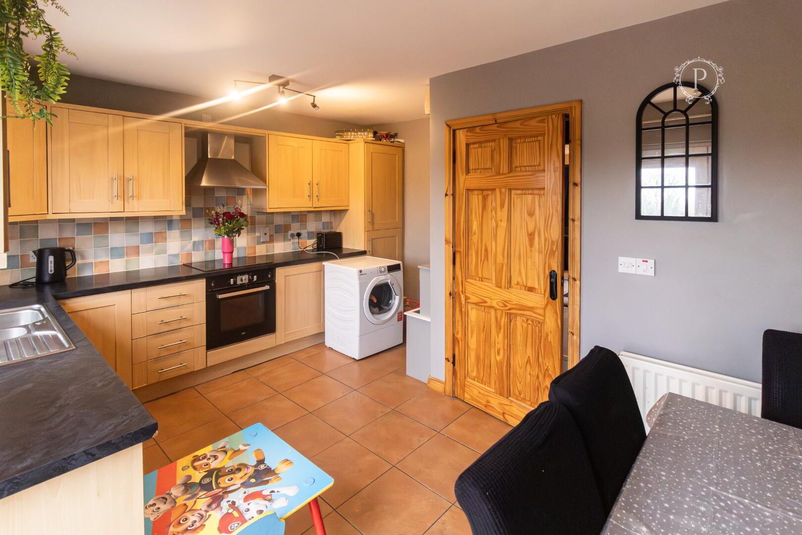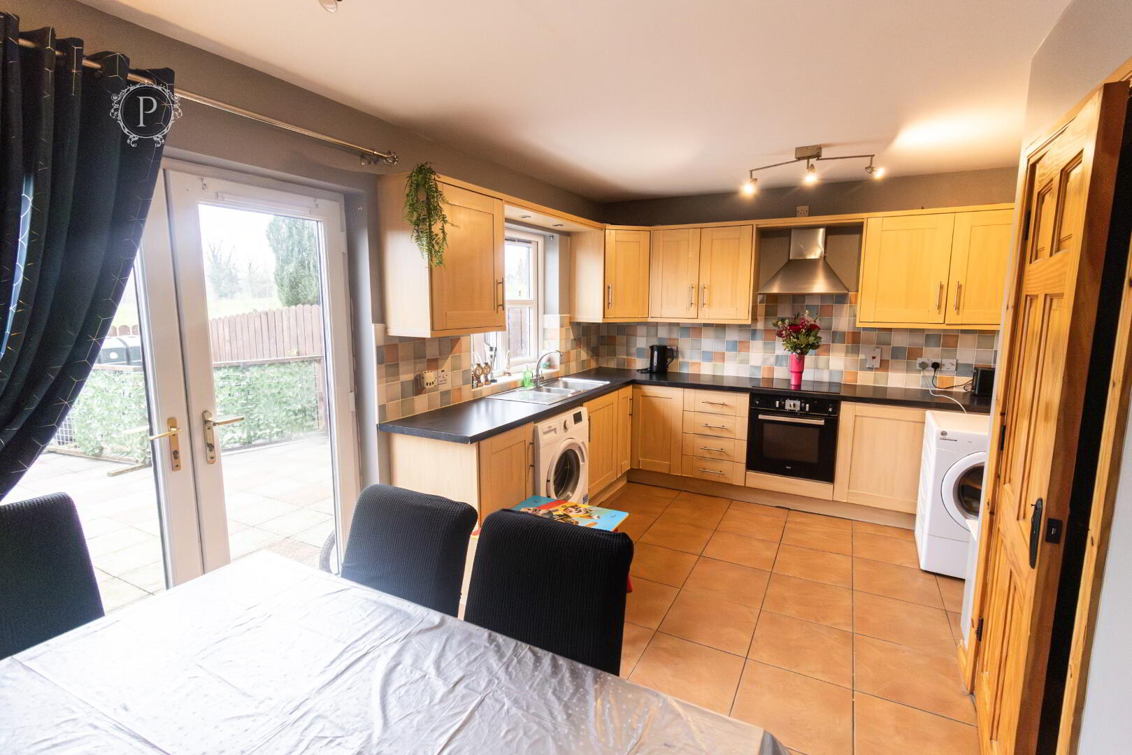 The kitchen and dining area forms the heart of the home, offering a spacious and highly functional layout suited to modern family living. The kitchen is fitted with a range of high and low level units providing excellent storage, complemented by generous worktop space and tiled splashback. Integrated cooking appliances are in place, while plumbing is provided for white goods.