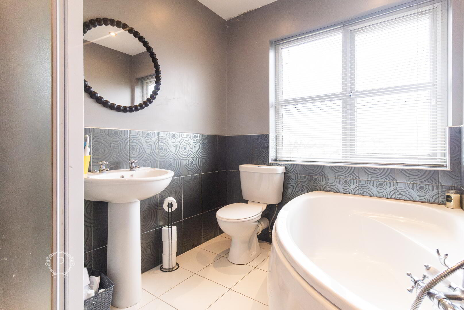 The first floor bathroom is fitted with a white suite including bath, wash hand basin and toilet. A window provides natural ventilation and light, while tiled finishes help ensure practicality and ease of maintenance. The room is well laid out and serves the household comfortably.