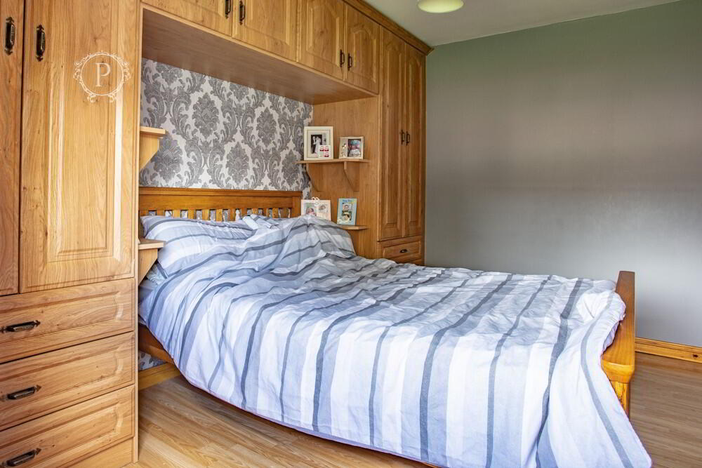 The first floor hosts three inviting bedrooms, each thoughtfully presented to balance comfort and practicality. The principal bedroom offers a generous space complemented by a full range of built-in wardrobes, drawers, and shelving, ensuring ample storage while framing the bed to create a cosy, finished look. A soft colour palette and large window enhance the sense of light and relaxation.