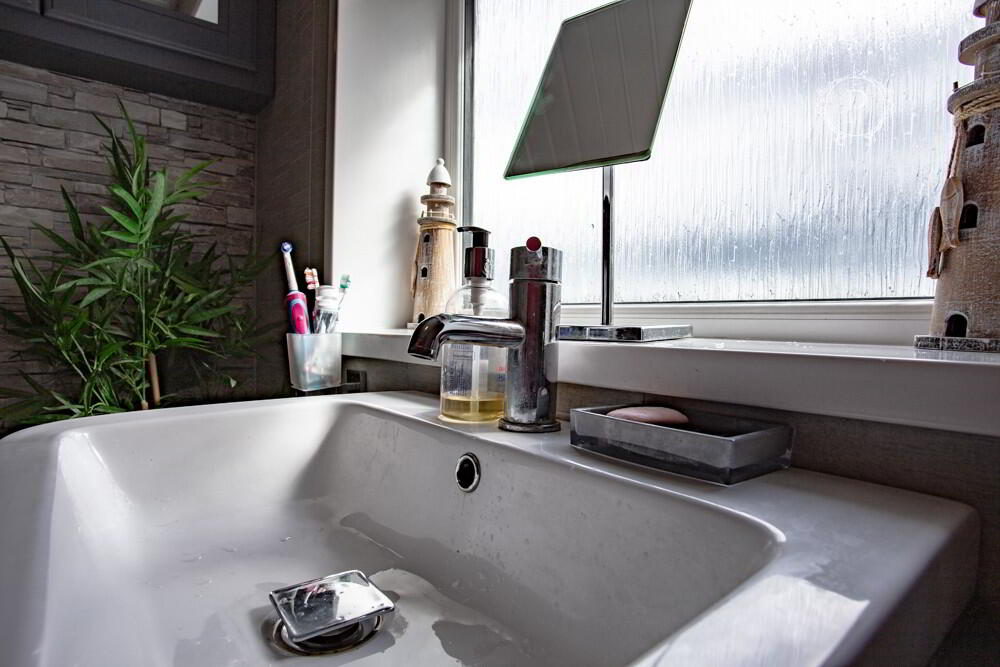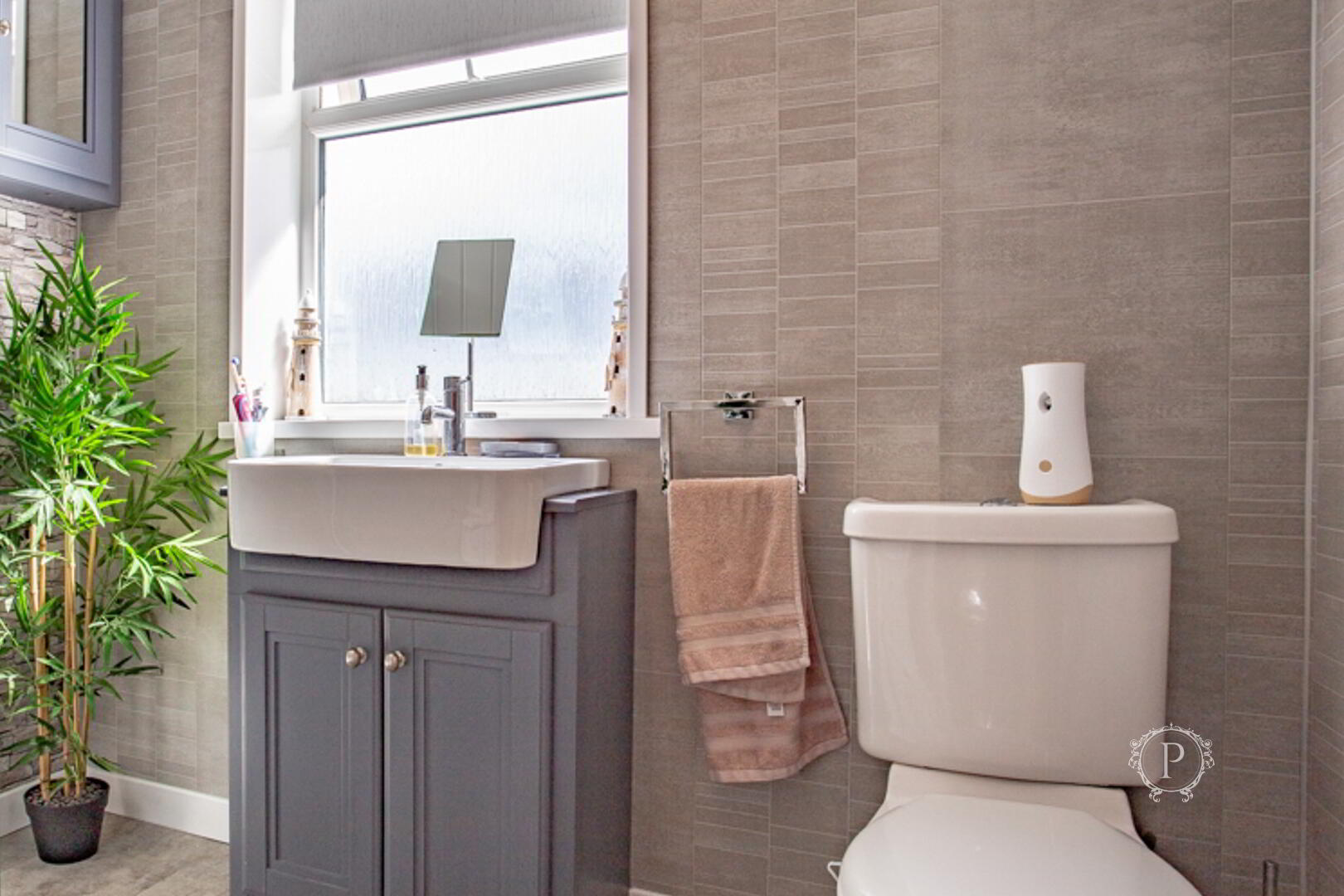 The first-floor bathroom has been thoughtfully styled with a modern finish, combining practicality and comfort. Featuring a contemporary three-piece suite with a bath and overhead shower, it provides versatility for both relaxing soaks and quick daily routines. The neutral wall tiles and sleek vanity unit with under-sink storage bring a touch of sophistication, complemented by the large frosted window that allows natural light to brighten the space while maintaining privacy.