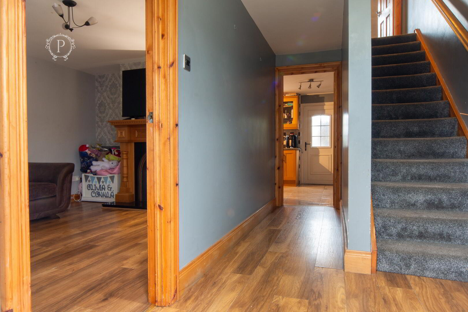 Stepping inside, the entrance hall sets a welcoming first impression, featuring wood-effect flooring that flows seamlessly through to the main living area. The space is bright and practical, with the staircase rising neatly to the first floor and access to both the lounge and kitchen, creating a natural and functional layout ideal for family living.