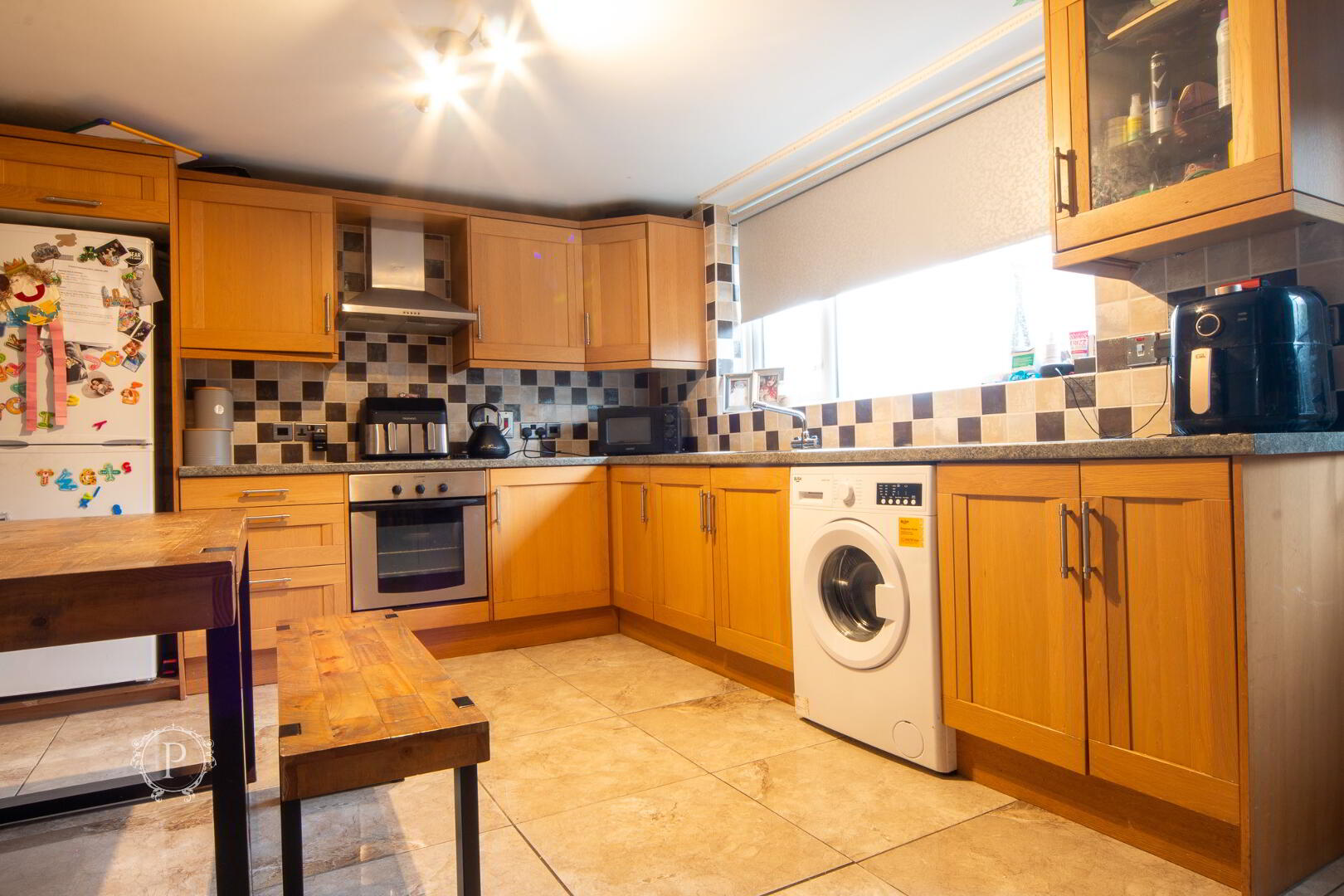 Positioned to the rear of the property, the kitchen and dining area is both spacious and functional, designed to accommodate everyday family living. Fitted with a generous range of solid wood cabinetry and integrated appliances, it offers ample workspace and storage alongside a relaxed setting for mealtimes or informal gatherings. The tiled flooring adds practicality, while a large rear window brings in plenty of natural light. A door opens directly to the back garden, providing easy access to outdoor space and a lovely sense of flow between indoors and out.