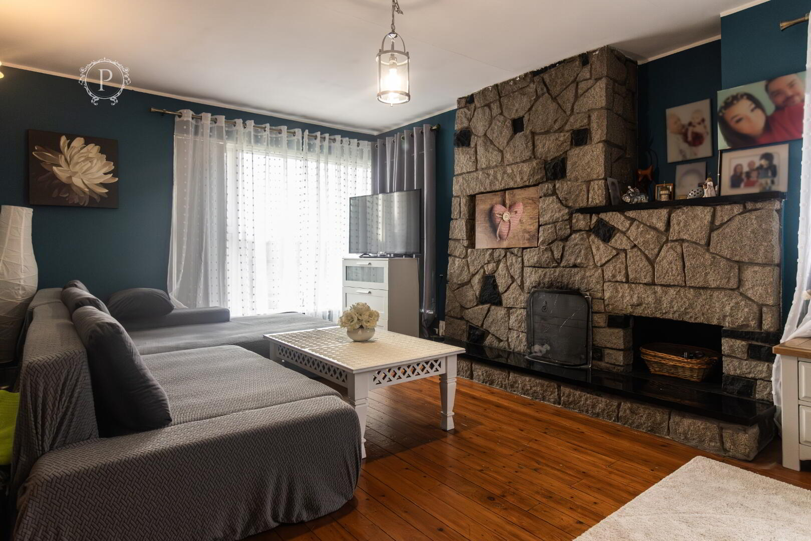 The living room is a generously proportioned and inviting space, centred around a striking stone-built fireplace with inset stove-style fire, creating a natural focal point. A large window ensures excellent natural light, while wooden flooring and tasteful décor combine to produce a warm and comfortable environment suited to both relaxation and entertaining.