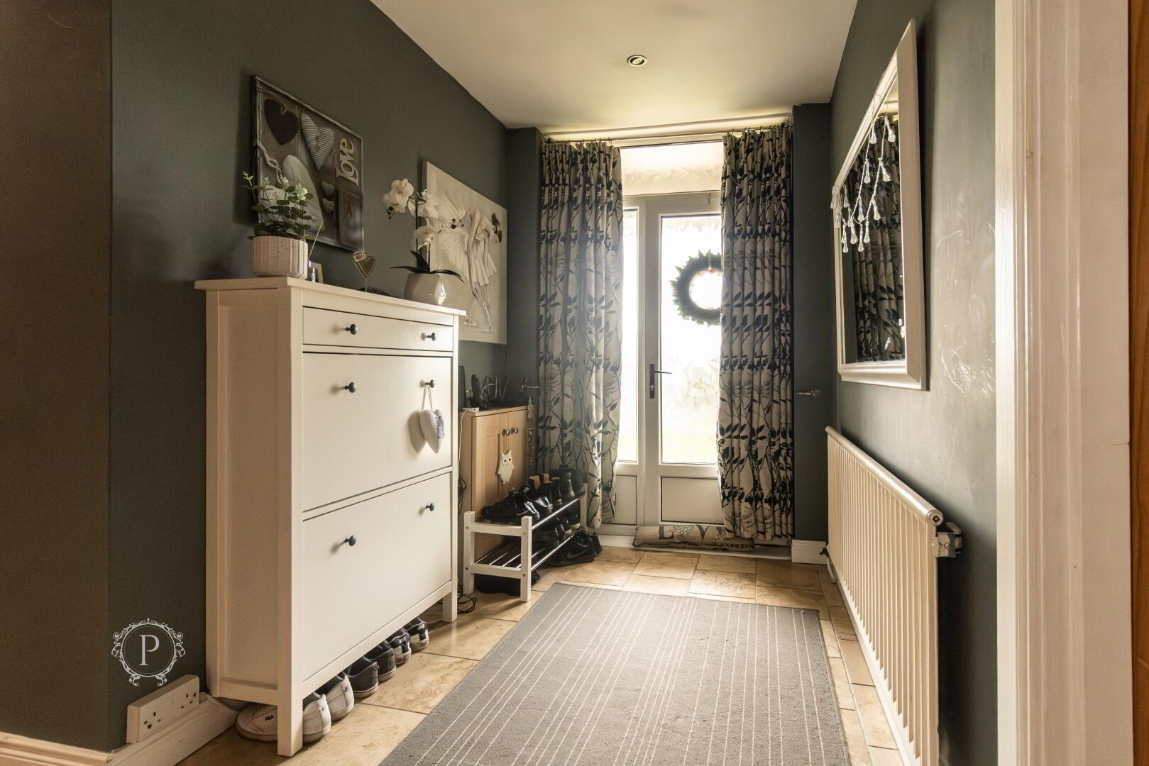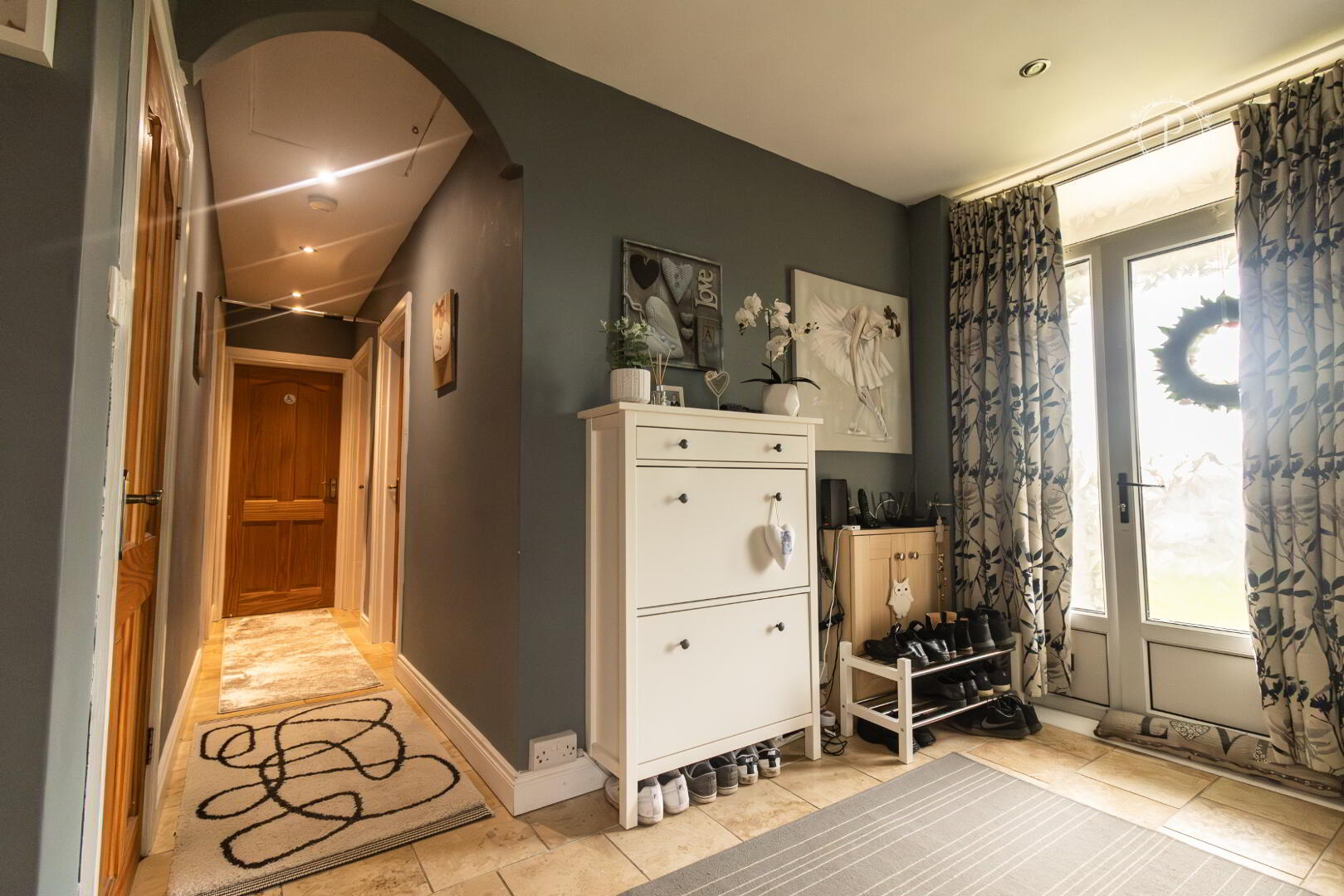 The entrance hall creates an immediate impression of a well-maintained home, offering a bright and welcoming space upon arrival. Finished with tiled flooring at the front, the area provides a practical yet stylish transition from outdoors, while a glazed rear door allows natural light to flow through. The hallway extends via an attractive arched opening, leading to the main accommodation and enhancing the sense of space throughout.