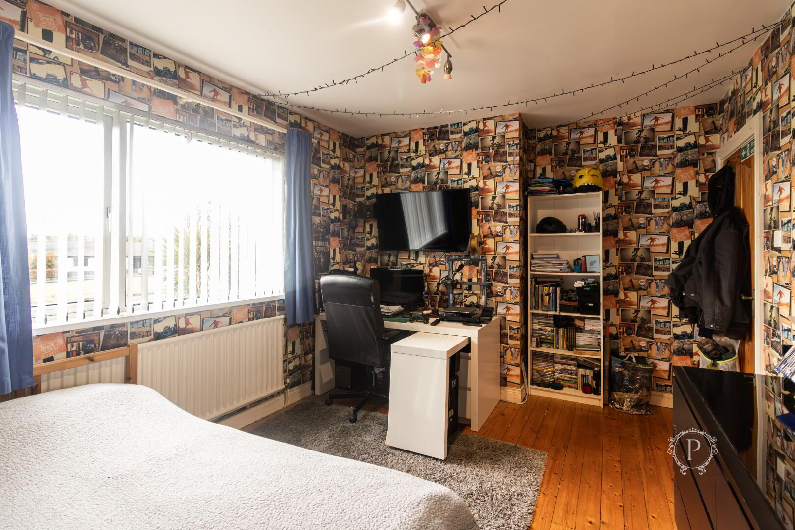 Bedroom two is a spacious and adaptable room, currently utilised as a bedroom and workspace, demonstrating its versatility. Generous proportions allow for a range of uses including guest accommodation or a home office, with natural light further enhancing the overall feel of the space.