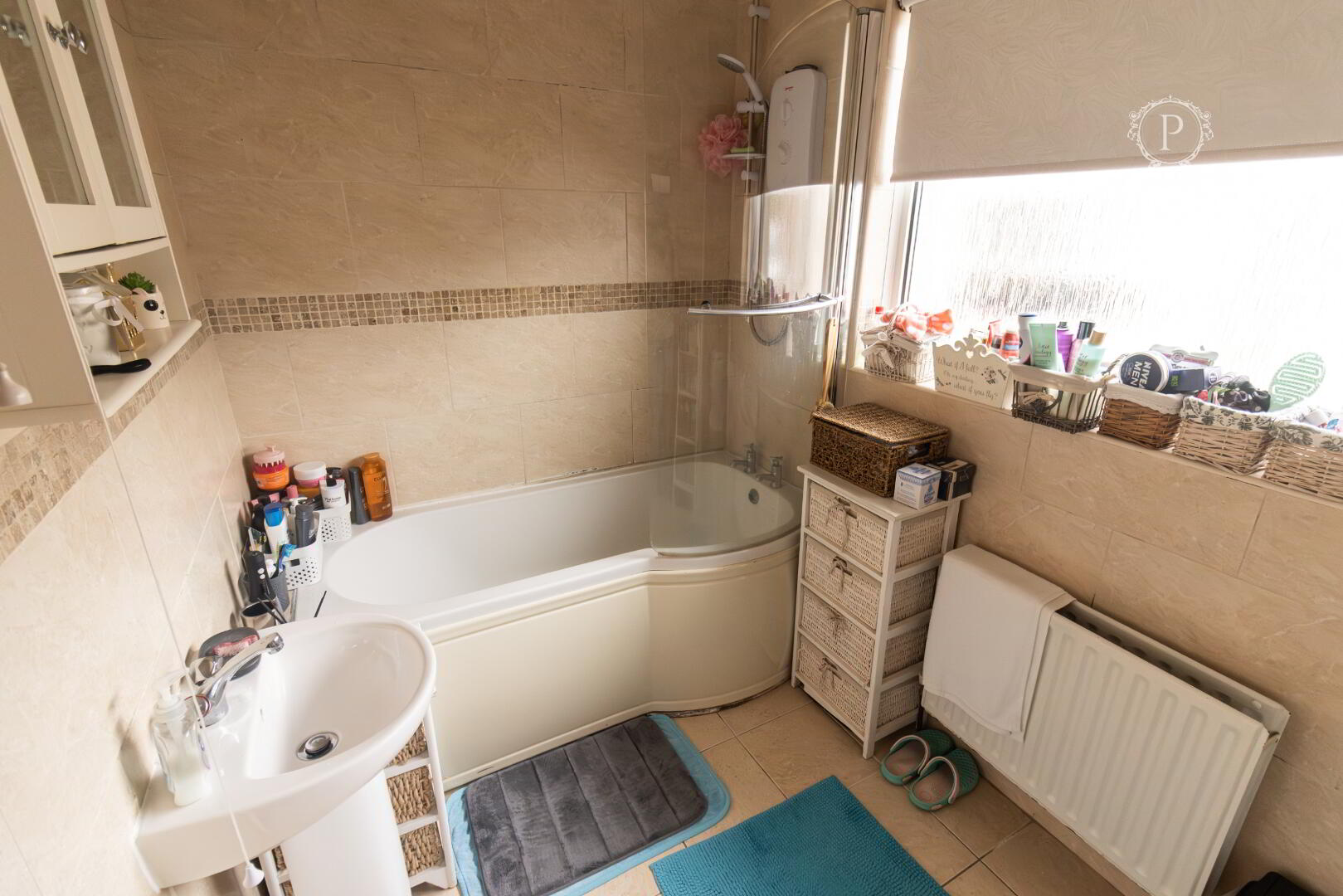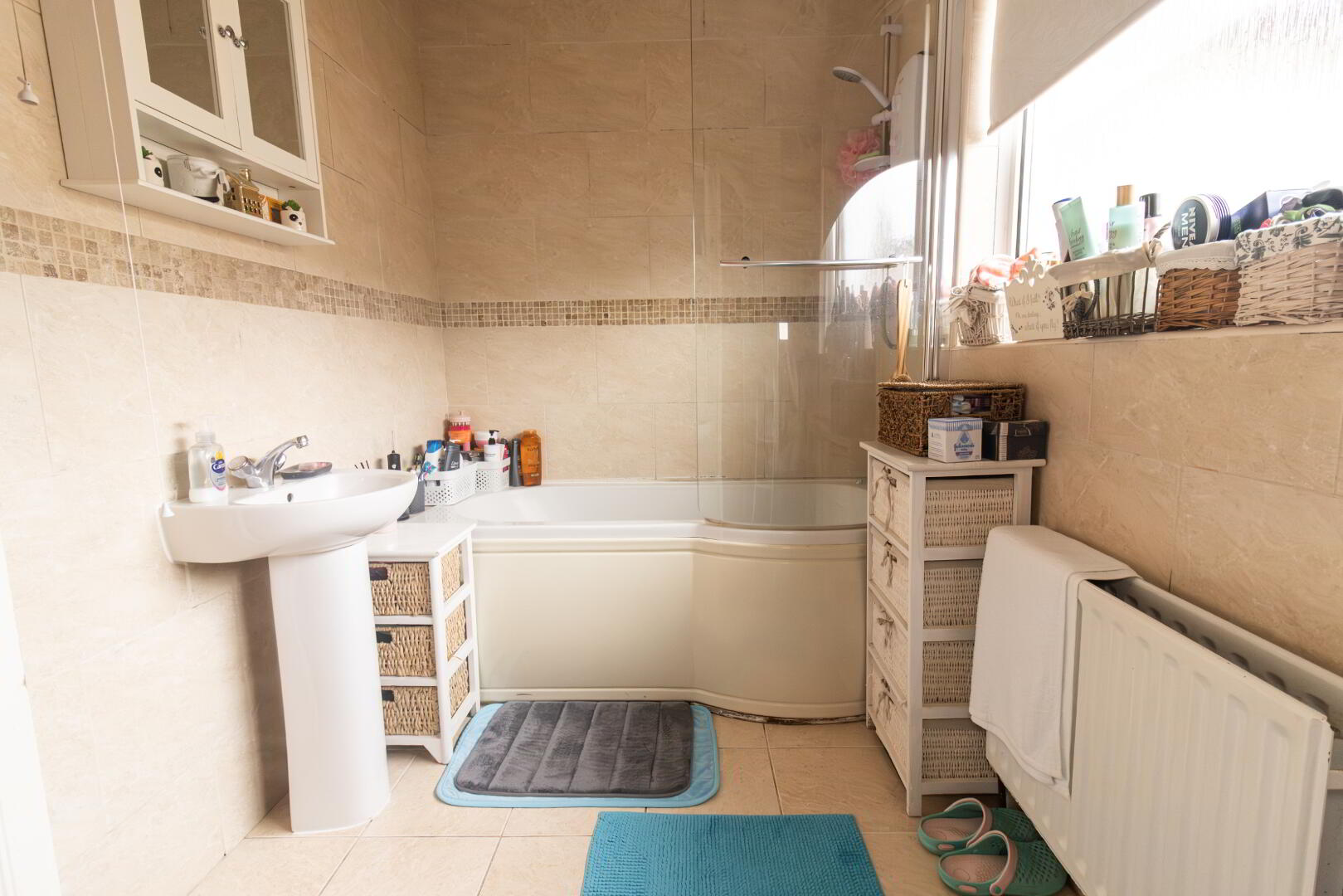 The bathroom is finished in a contemporary style and comprises a panelled bath with overhead shower and curved glass screen, pedestal wash hand basin, and low flush W.C. Fully tiled throughout and complemented by a large frosted window, the space is bright, functional, and easy to maintain.