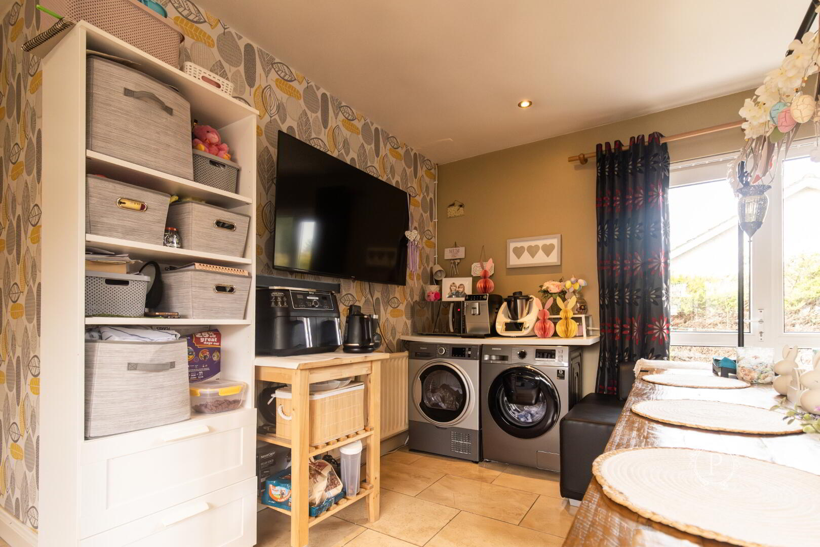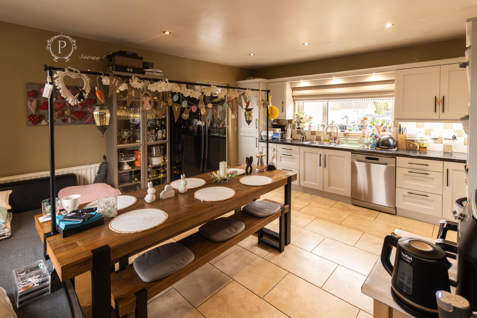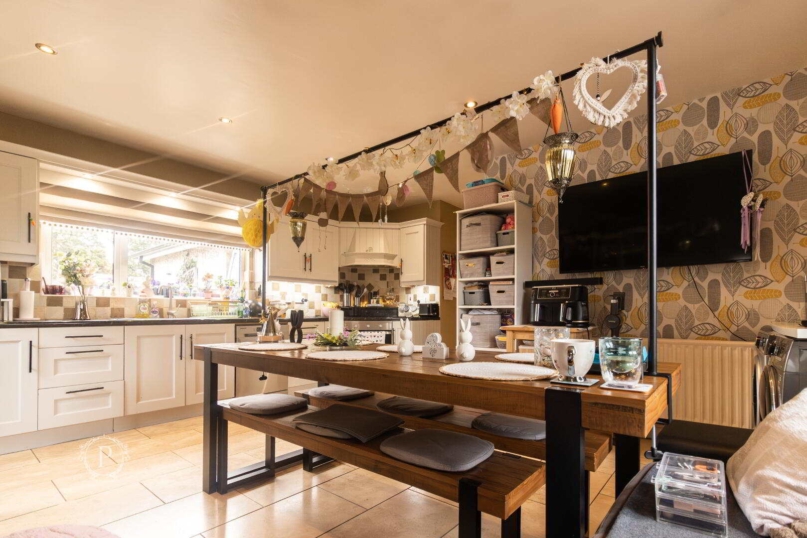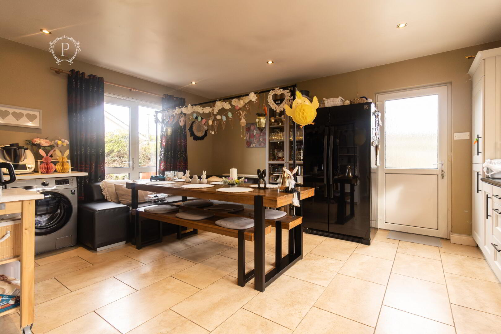 The kitchen/dining area forms the heart of the home, offering a spacious and functional layout ideal for modern living. Fitted with a range of high and low-level units, ample worktop space, and tiled finishes, the kitchen is both practical and well-presented. The adjoining dining area comfortably accommodates a family table, while direct access to the rear enhances everyday convenience and usability.