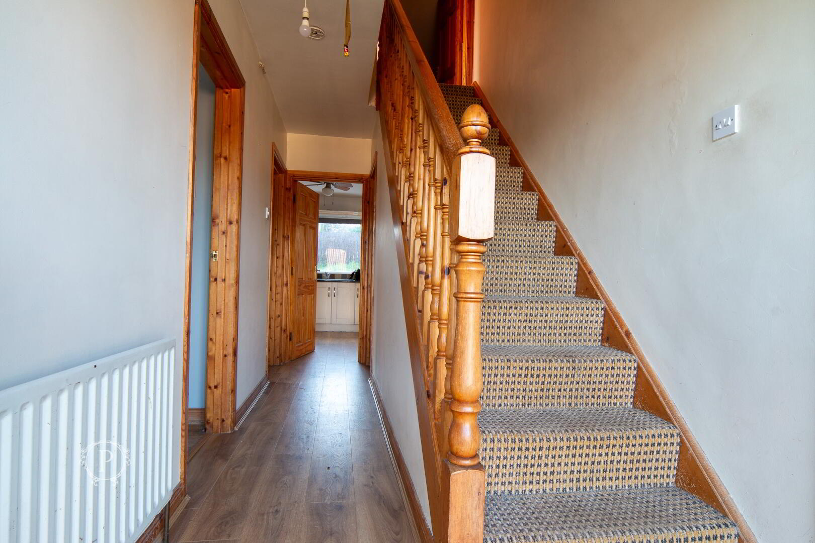Bright and welcoming entrance hall with wood-effect flooring and a carpeted staircase leading to the first floor. The hallway provides access to the main ground floor accommodation and benefits from a radiator and natural light, creating an inviting first impression on arrival.