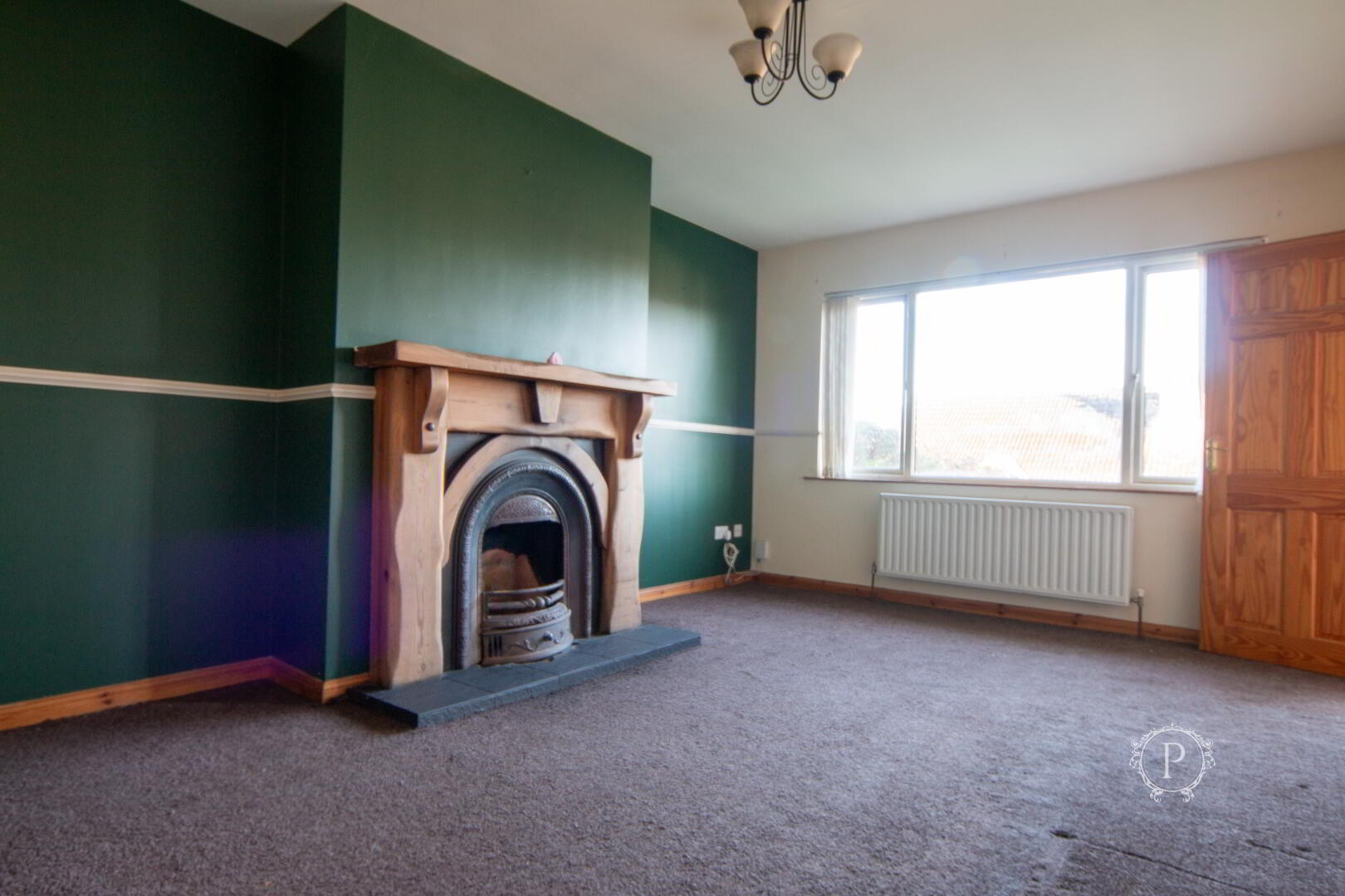 Spacious and well-proportioned living room featuring a decorative fireplace with timber surround and tiled hearth, providing a central focal point to the room. The space is further enhanced by a large front-facing window allowing for excellent natural light, with carpet flooring, feature wall décor and a radiator completing this comfortable reception room.