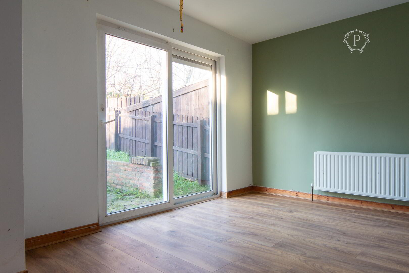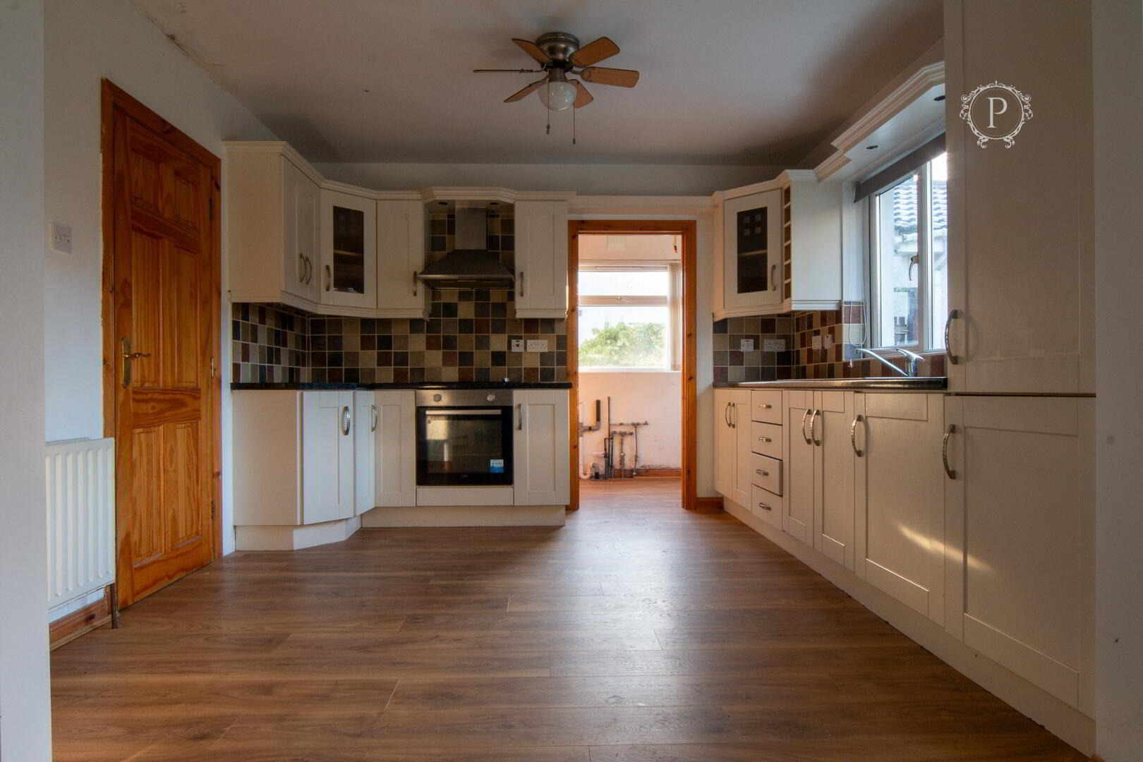 Spacious open-plan kitchen and dining area fitted with a range of high and low level units with complementary worktops and tiled splashback. The kitchen includes an integrated oven, hob with extractor hood and stainless steel sink unit, with ample space for dining. Wood-effect flooring runs throughout, enhancing the sense of space and flow. The dining area benefits from sliding patio doors providing direct access to the rear garden area, allowing for excellent natural light and an ideal layout for everyday family living or entertaining. A ceiling fan light, radiator and access through to the utility room complete this practical and well-proportioned space.