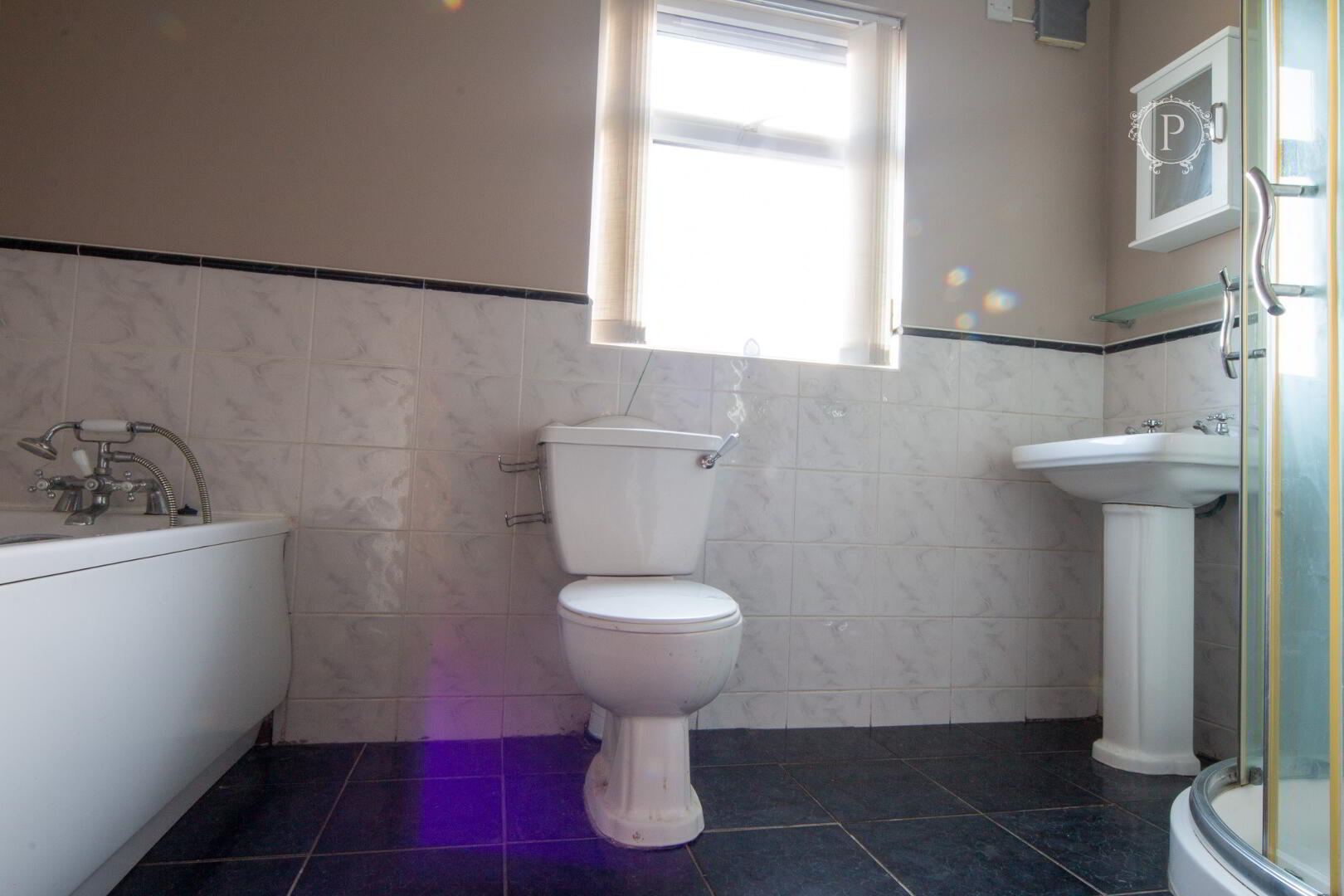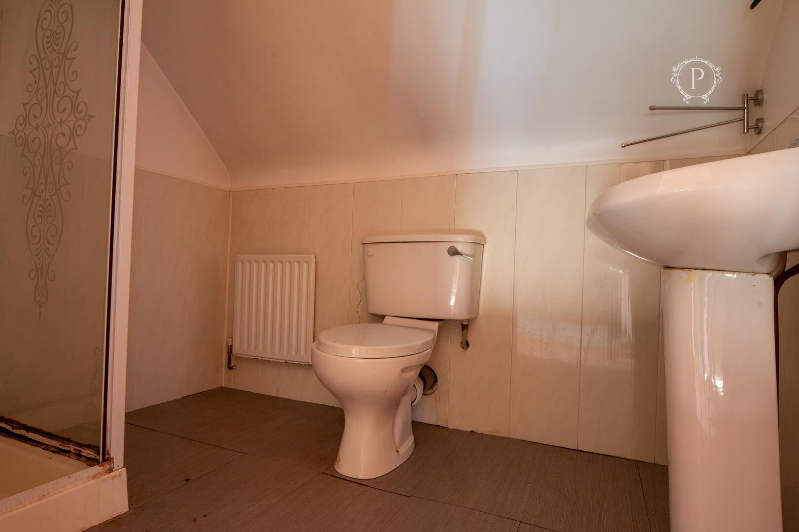 Conveniently located on the ground floor, this spacious bathroom is equipped with a three-piece suite, including a panelled bath with shower attachment, a pedestal sink and a WC. The room is finished with neutral tiling and a window for natural light, providing flexibility for both a quick shower or a relaxing soak.